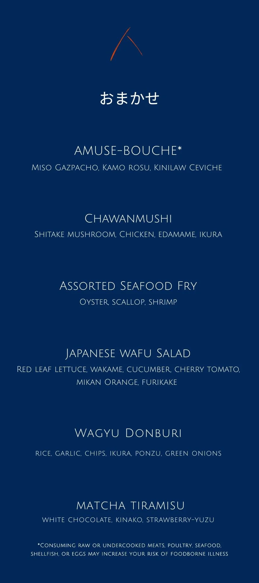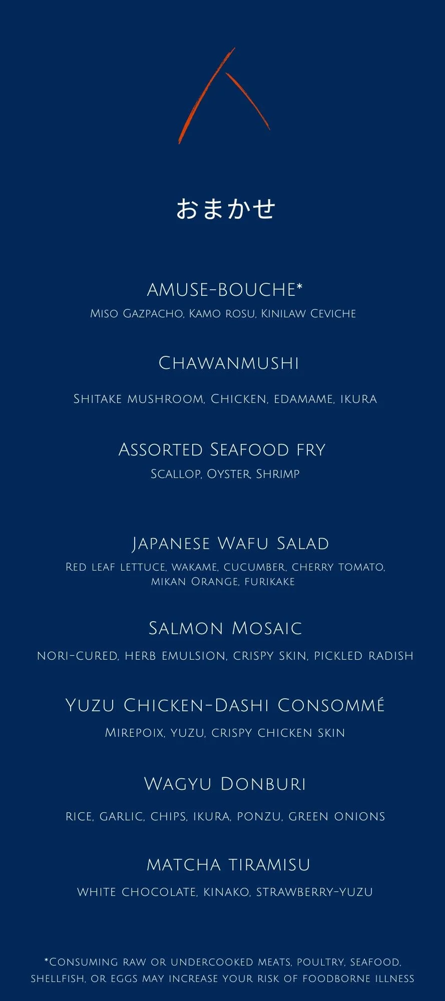 MENU Omakase Course Seasonally Rotating MenuSpring (Apr 1st - July 31st)TOKUSEN (8-Course) TEIBAN (6-Course) Year-Round Menu SANKAI